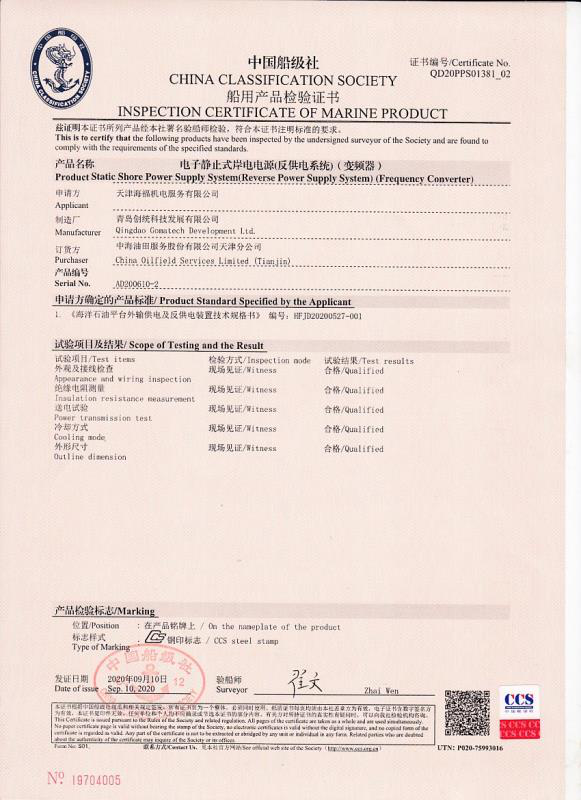 岸電設備通過了中國船級社認證并獲得認證證書,獲得國家電力電子產(chǎn)品質量監(jiān)督檢驗中心檢測證書。